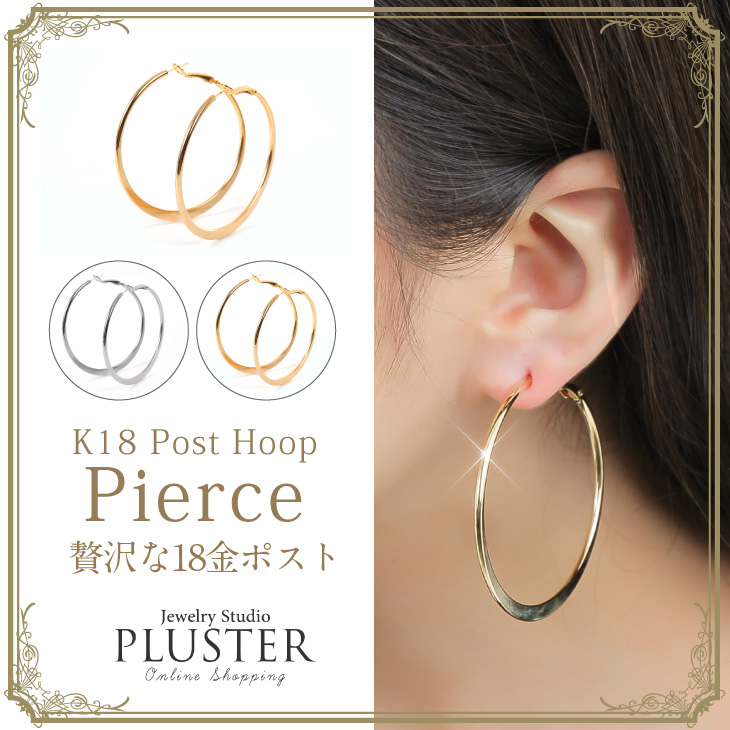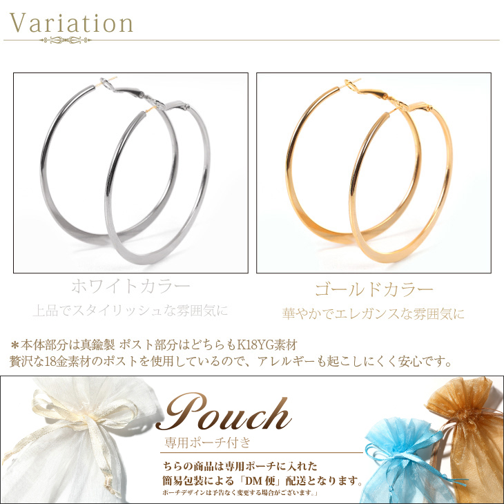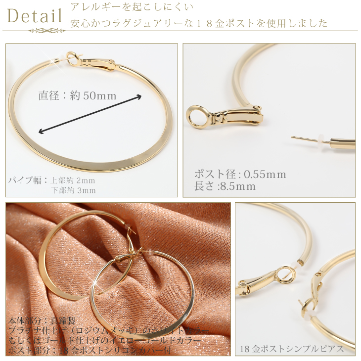 | サイズ | ポスト太さ 約0.55mm ポストの長さ 約8.5mm サイズ フープ直径:約50mm パイプ径:約2mm |