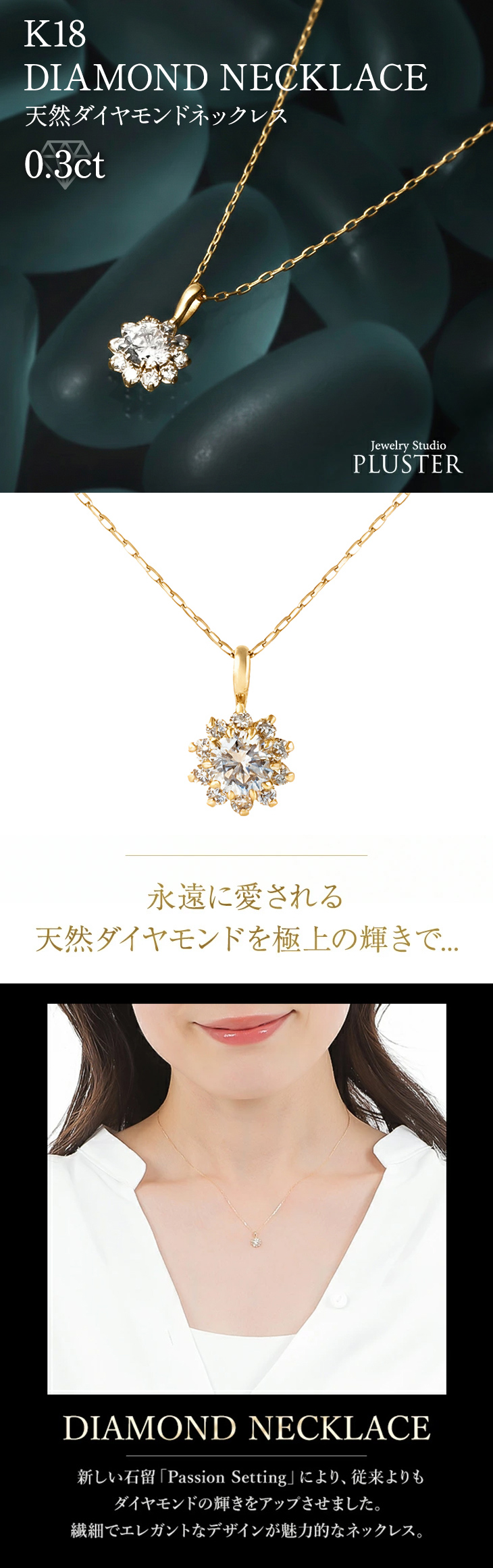 【厳選された天然ダイヤモンド ネックレス】鑑定士が輝き・テリの良いダイヤモンドを厳選してお届け。K18素材の高級感とダイヤの煌めき。ハイクラスなダイヤモンドネックレスは特別な贈り物に人気。デザインは永遠に愛される定番の中石取り巻きタイプ。その定番のデザインに特許の技法「Passion Setting」を用いることでダイヤモンドの輝きをアップさせました。繊細でエレガントなつくりも魅力的です。【付属品】ギフトケース、ギャランティカード、紙袋。そのままプレゼントとしてお渡し出来るので、彼女や妻、お母様など、女性へのギフトとしてもおすすめのダイヤモンドネックレスです。シンプルなK18素材ダイヤモンドネックレスは女性へのギフトにもおすすめのアクセサリーです。長年ダイアモンドの海外買付や卸売を手掛けてきた【ジュエリースタジオ プラスターならではのお得なプライスで】ダイヤモンドペンダントは、プロポーズ・バレンタイン・ホワイトデー・母の日・クリスマス・誕生日プレゼント・結婚のお祝いや記念日に。また出産後のプレゼントに、お嬢様への卒業や入学のお祝いなどでも人気の商品です。高い技術による細工を施し、願いを込めてお作りさせて頂きます。