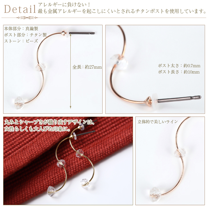 | サイズ | ポスト太さ 約0.7mm ポストの長さ 約10mm 全長 約27mm ストーンサイズ ビーズ約4mm |