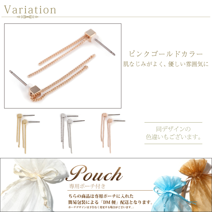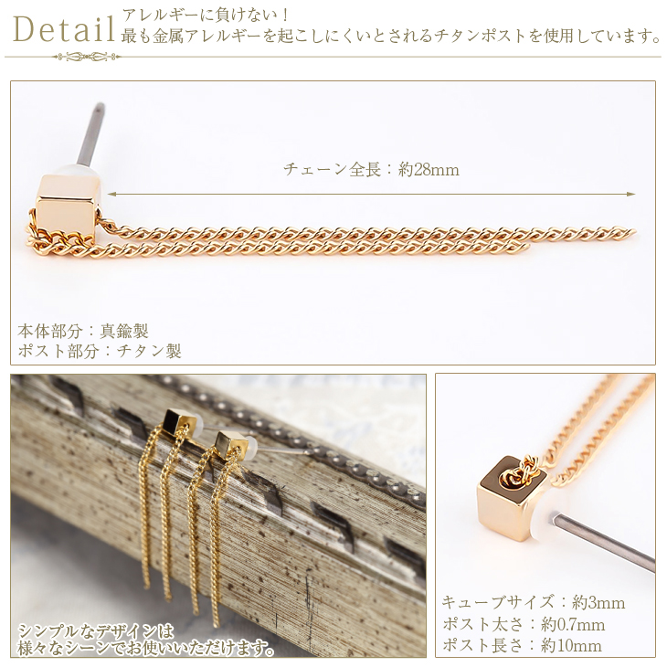 | サイズ | ポスト太さ 約0.7mm ポストの長さ 約10mm チェーン長さ 約28mm キューブサイズ 約3mm |