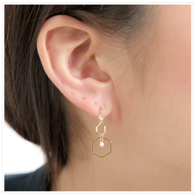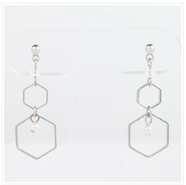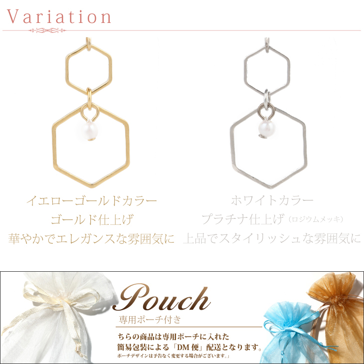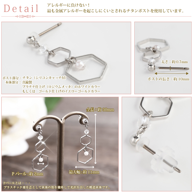 | サイズ | ポスト太さ 約0.7mm ポストの長さ 約10mm フープのサイズ 最大約11mm 全長約30mm P-パール 約2mm |