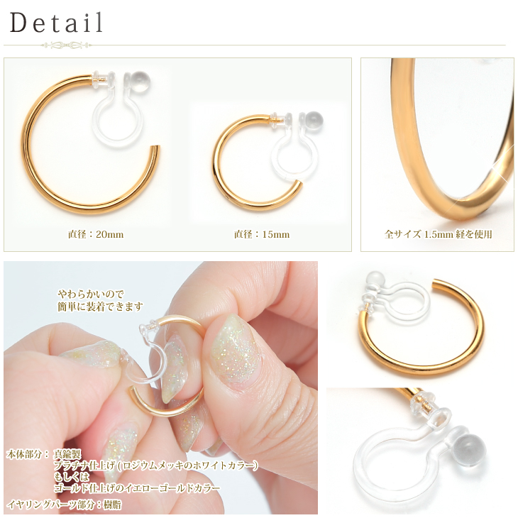 | サイズ/素材詳細 | 本体部分 真鍮製プラチナ仕上げ(ロジウムメッキのホワイトカラー)もしくはゴールド仕上げのイエローゴールドカラー 全サイズ1.5mm経を使用 イヤリングパーツ部分樹脂 |