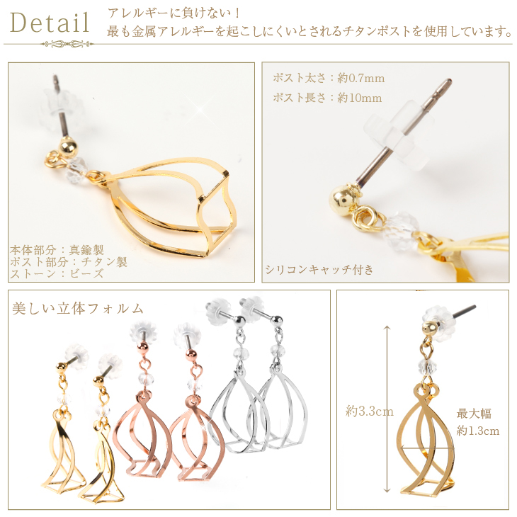 | サイズ | ポスト太さ 約0.7mm ポストの長さ 約10mm 全長 約3.3cm 最大幅 約1.3cm |