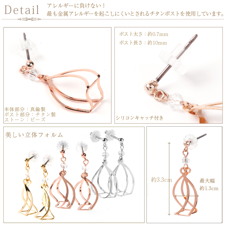 | サイズ | ポスト太さ 約0.7mm ポストの長さ 約10mm 全長 約3.3cm 最大幅 約1.3cm |