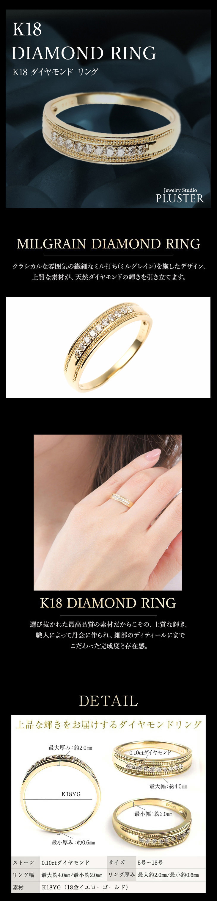 【天然ダイヤモンド×18金素材】上質なK18ダイヤモンドリング。洗練されたダイヤモンドを使用したシンプルデザインのリングは、結婚記念日はもちろん、人生の特別な節目の贈り物、女性へのギフトとしてもおすすめです。 【素材・商品サイズ】ストーン:ダイヤモンド0.10ct 最大幅:約4.0mm 最小幅:約2.0mm 最大厚み:約2.0mm 最小厚み:約0.6mm リングサイズ:5号~18号 金性:18金素材 K18 【付属品】ギフトケース、ギャランティカード、お礼状、紙袋。そのままプレゼントとしてお渡し出来るので、彼女や妻、お母様など、大切な方への贈り物としてもおすすめです。 手元を女性らしく華やかに演出をしてくれるダイヤリングは結婚指輪や婚約指輪にも最適です。長年ダイヤモンドの海外買付や卸売を手掛けてきた【ジュエリースタジオ プラスターならではのお得なプライスで】 結婚のお祝いや記念日に。また母の日・誕生日プレゼント・クリスマス、ご自身へのプレミアムなご褒美ジュエリーにも人気の商品です。