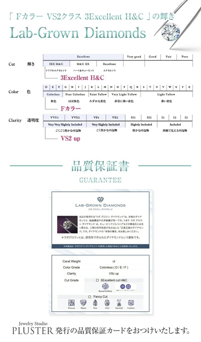 | ストーン | ラボグロウンダイヤモンド total 1.0ct カラー:Fカラーup/クラリティ:VSクラス ラボ・グロウン・ ダイヤモンドは最新テクノロジーが生み出した天然ダイヤモンドと結晶構造や化学組成が同一の合成ダイヤモンドです。 |
