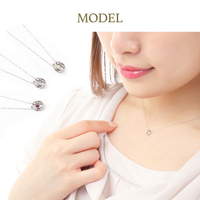 | ダンシングストーンの中石の角度は、本体の角度と比較すると常に斜め上を向いています。 着用した際に、胸元の傾斜によって本体の角度と中石の角度が平行になり、揺れ感が最大になるように設計されているためです。 それにより「ネックレスを手で持つ」「机に置く」「前かがみになって鏡を見る」などの際には、揺れを感じにくい場合があります。 「胸元に装着している時が、最も揺れて輝く」設計になっていますので、踊るように揺れ続ける、可憐なダンシングストーンネックレスの輝きをお楽しみください。 |