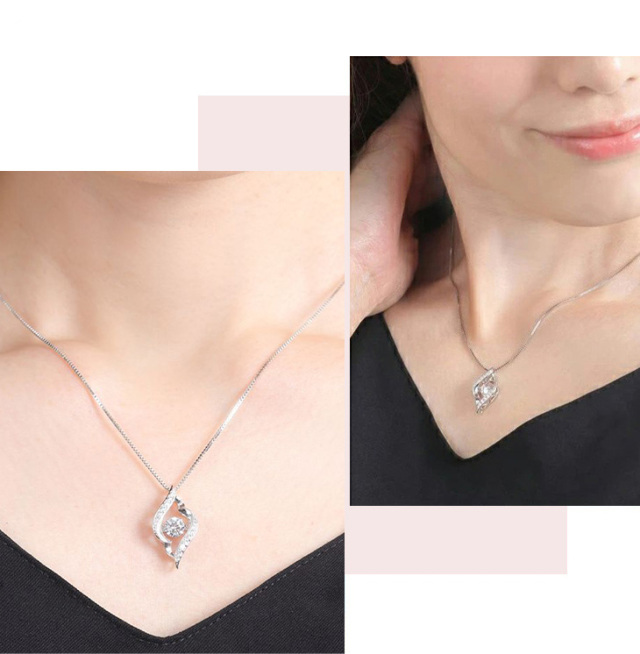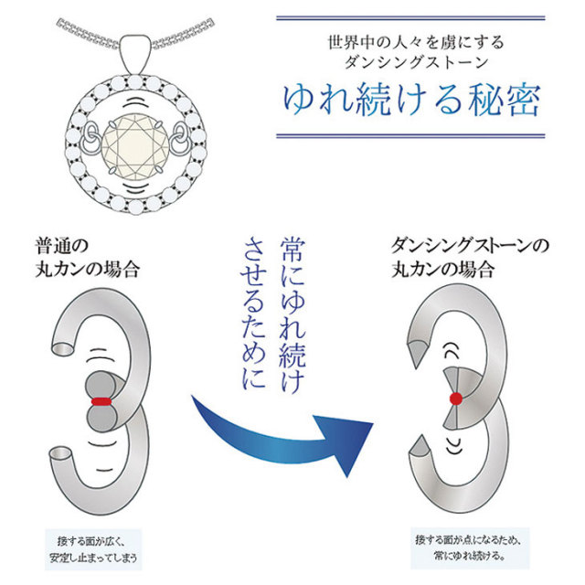 | ダンシングストーンの中石の角度は、本体の角度と比較すると常に斜め上を向いています。 着用した際に、胸元の傾斜によって本体の角度と中石の角度が平行になり、揺れ感が最大になるように設計されているためです。 それにより「ネックレスを手で持つ」「机に置く」「前かがみになって鏡を見る」などの際には、揺れを感じにくい場合があります。 「胸元に装着している時が、最も揺れて輝く」設計になっていますので、踊るように揺れ続ける、可憐なダンシングストーンネックレスの輝きをお楽しみください。 |