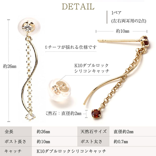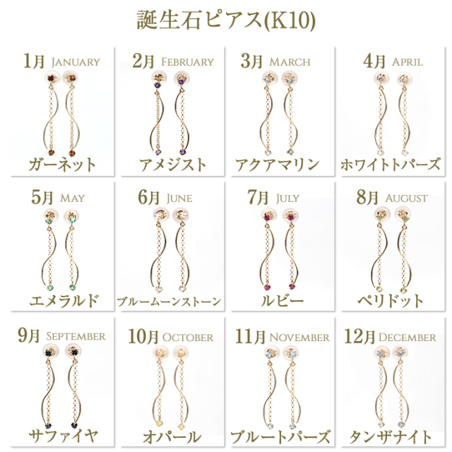 【金属アレルギー対応】アレルギーの方にも優しいK10YGポストを使用。お揃いやギフトにも最適なアレルギーフリーの誕生石ピアス。ファーストピアスとしてもおすすめのピアスは、シンプルなのでどんなシーンにも合わせやすいです。 【K10YG×天然石】 全長:約26? 天然石: 直径約2? 1月ガーネット/2月アメジスト/3月アクアマリン/4月ホワイトトパーズ/5月エメラルド/6月ブルームーン/7月ルビー/8月ペリドット/9月サファイヤ/10月オパール/11月ブルートパーズ/12月タンザナイト ポスト:長さ約10? 太さ0.7? キャッチ:K10ダブルロックシリコンキャッチ 金性:K10YG 【付属品】ギフトケース、ギャランティカード、お礼状、紙袋。そのままプレゼントとしてお渡し出来るので、彼女や妻、お母様など、女性へのギフトとしてもおすすめです。 耳元で揺れてお顔回りが華やかになります。キャッチは外れにくいダブルロックキャッチ、小ぶりのピアスなのでオフィスやデイリーにもおすすめ。 プロポーズ・母の日・誕生日プレゼント・結婚のお祝いや記念日に。またのプレゼントに。パーティーやお呼ばれのコーディネートにも最適です。
