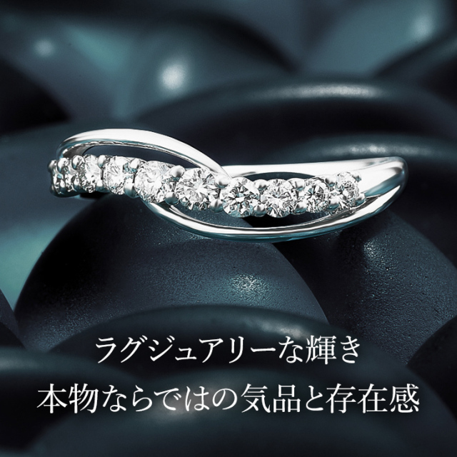 天然ダイヤモンド10石を配置した柔らかなラインは、女性の指を長く、細く見せてくれます。プロポーションの美しさだけでなく、光を最大限取り込み、つけ心地にもこだわりました。