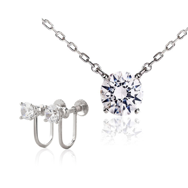 | ストーン | 「 キュービックジルコニア H&C ( ハート&キューピッド )」を使用 ネックレス:直径:約5.25mm×1石 直径:約1mm×20石使用 イヤリング:直径:約4mm(0.3ct相当) |