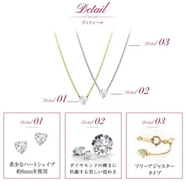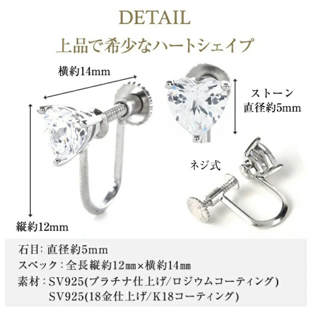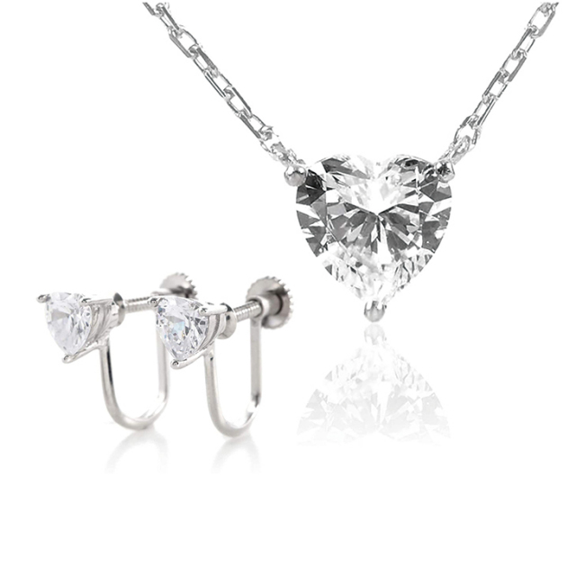 | ストーン | 「 キュービックジルコニア ( ハート&キューピッド )」を使用 ネックレス:ハートシェイプ1.0ct相当×1pc イヤリング:直径:約5mm(0.5ct相当) |