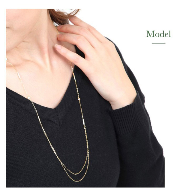 | 素材の美しさを引き出すシンプルなパーツと上品なチェーンのステーションロングネックレスは、すぐに使える優れもの。同じ「emolliant」シリーズと重ねたり、お手持ちのジュエリーとコーディ ネートしたり、このロングネックレスを投入するだけで旬のスタイルが完成します! |