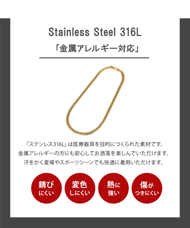 | サージカルステンレス 「 ステンレス316L 」は、汗などに接触しても金属が溶け出しにくく、アレルギー反応を起こしにくい、「 金属アレルギー対応 」の肌に優しい素材です。インプラントなどの医療現場でも使われている素材です。ステンレスには必ず番号がありますので「 Stainless steel 316L 」など、番号が明記されている商品のご購入をおすすめします。 ”錆びにくく変色も少ない”ため、汗をかいてもかぶれない、かゆくならないことが多く、スポーツや「 つけっぱなし 」にされたい方にも人気。女性だけでなく男性にもおすすめです。" ノンアレルギー "対応の「 アレルギーフリーネックレス 」として、ジュエリースタジオ プラスターの【 フリーレーベルコレクション 】が好評を得ています。※こちらの商品は、医療用の器具に使用しているステンレスと同じ素材のステンレスになりますが、医療器具ではありません。アレルギー反応には個人差がございますので、全ての方に適合するものではありません。 |
