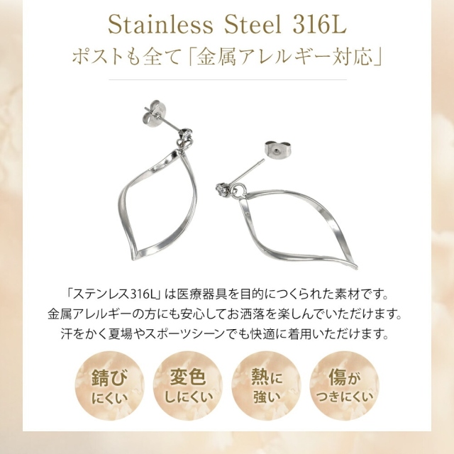 | サージカルステンレス 「 ステンレス316L 」は、汗などに接触しても金属が溶け出しにくく、アレルギー反応を起こしにくい、「 金属アレルギー対応 」の肌に優しい素材です。インプラントなどの医療現場でも使われている素材です。ステンレスには必ず番号がありますので「 Stainless steel 316L 」など、番号が明記されている商品のご購入をおすすめします。 ”錆びにくく変色も少ない”ため、汗をかいてもかぶれない、かゆくならないことが多く、スポーツや「 つけっぱなし 」にされたい方にも人気で女性だけでなく男性にもおすすめです。" ノンアレルギー "対応の「 アレルギーフリーピアス 」として、ジュエリースタジオ プラスターの【 フリーレーベルコレクション 】が好評を得ています。 ※こちらの商品は、医療用の器具に使用しているステンレスと同じ素材のステンレスになりますが、医療器具ではありません。アレルギー反応には個人差がございますので、全ての方に適合するものではありません。 |