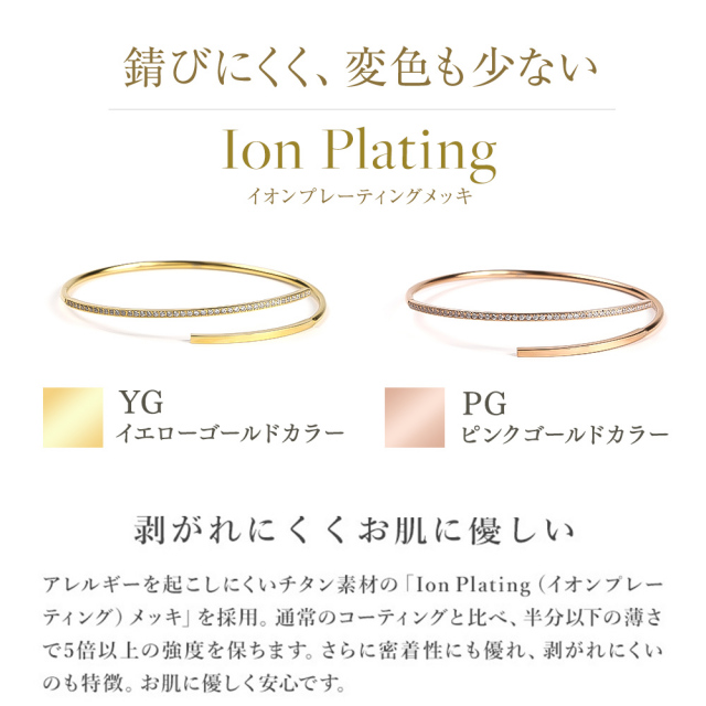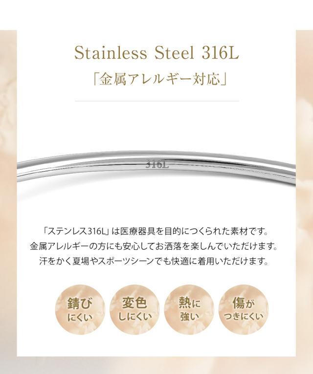 | サージカルステンレス 「 ステンレス316L 」は、汗などに接触しても金属が溶け出しにくく、アレルギー反応を起こしにくい、「 金属アレルギー対応 」の肌に優しい素材です。インプラントなどの医療現場でも使われている素材です。ステンレスには必ず番号がありますので「 Stainless steel 316L 」など、番号が明記されている商品のご購入をおすすめします。 ”錆びにくく変色も少ない”ため、汗をかいてもかぶれない、かゆくならないことが多く、スポーツや「 つけっぱなし 」にされたい方にも人気で女性だけでなく男性にもおすすめです。" ノンアレルギー "対応の「 アレルギーフリーブレスレット 」として、ジュエリースタジオ プラスターの【 フリーレーベルコレクション 】が好評を得ています。 ※こちらの商品は、医療用の器具に使用しているステンレスと同じ素材のステンレスになりますが、医療器具ではありません。アレルギー反応には個人差がございますので、全ての方に適合するものではありません。 |