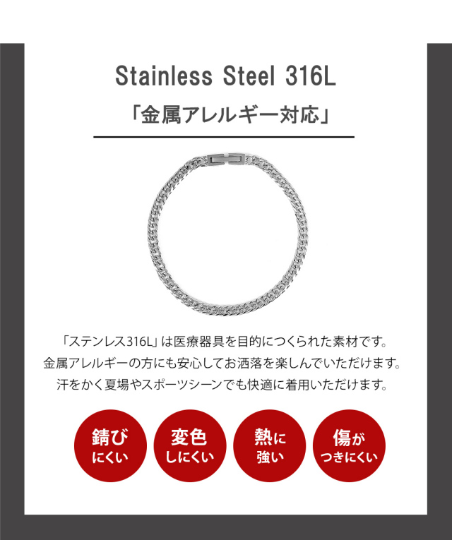 | サージカルステンレス 「 ステンレス316L 」は、汗などに接触しても金属が溶け出しにくく、アレルギー反応を起こしにくい、「 金属アレルギー対応 」の肌に優しい素材です。インプラントなどの医療現場でも使われている素材です。ステンレスには必ず番号がありますので「 Stainless steel 316L 」など、番号が明記されている商品のご購入をおすすめします。 ”錆びにくく変色も少ない”ため、汗をかいてもかぶれない、かゆくならないことが多く、スポーツや「 つけっぱなし 」にされたい方にも人気。女性だけでなく男性にもおすすめです。" ノンアレルギー "対応の「 アレルギーフリーブレスレット 」として、ジュエリースタジオ プラスターの【 フリーレーベルコレクション 】が好評を得ています。※こちらの商品は、医療用の器具に使用しているステンレスと同じ素材のステンレスになりますが、医療器具ではありません。アレルギー反応には個人差がございますので、全ての方に適合するものではありません。 |