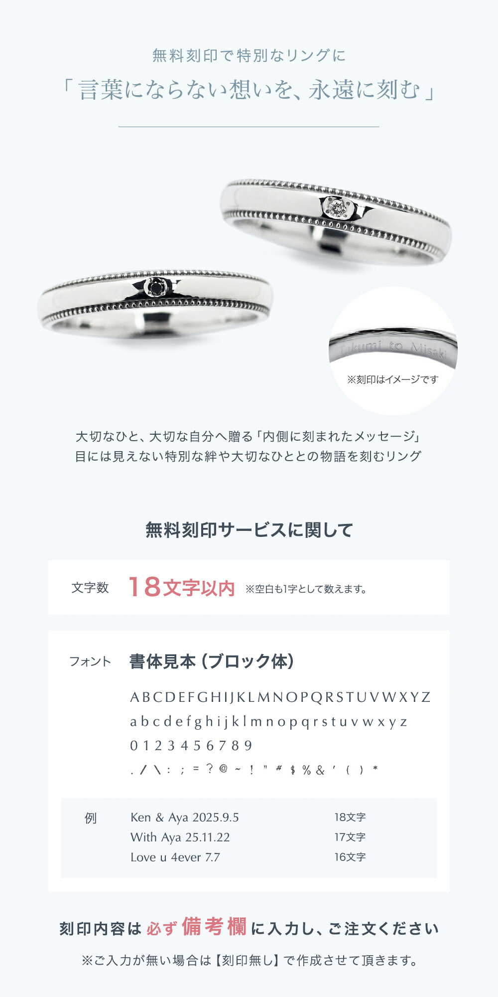 ※ペアでご購入のお客様は「男性用」「女性用」それぞれ刻印をご記載ください。