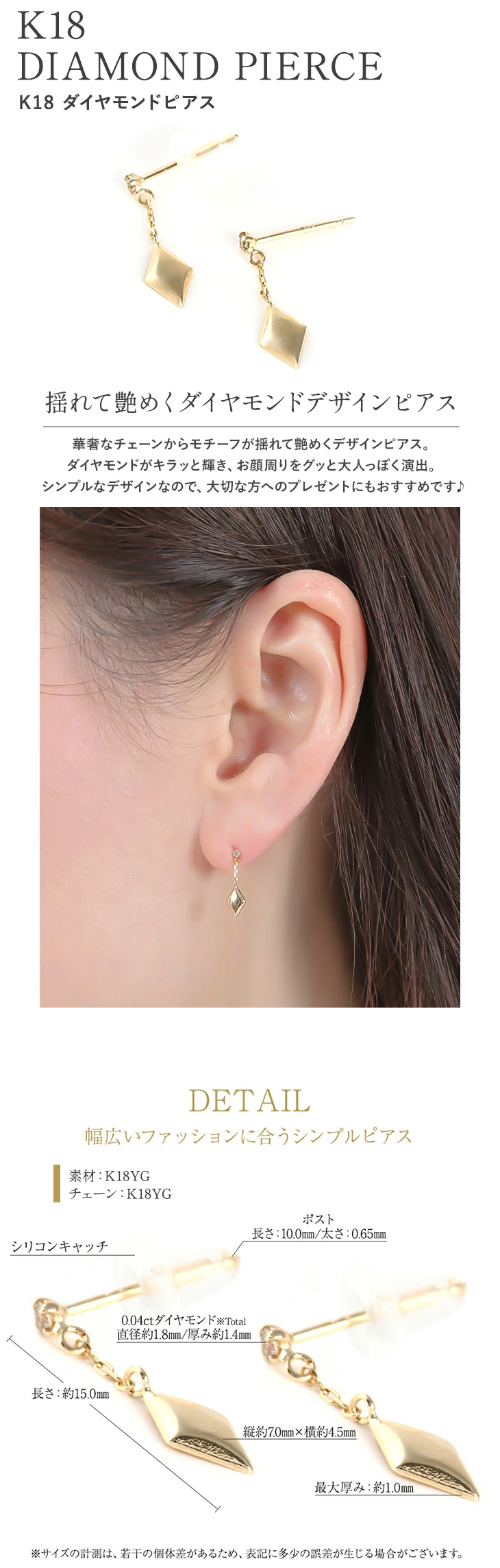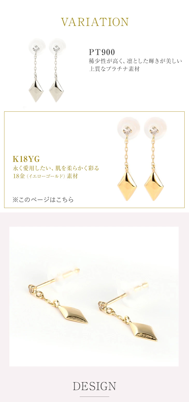 | 喜びポイント | シンプル 大人 可愛い かわいい 人気 お揃い 綺麗 キラキラ おしゃれ お洒落 トレンド おすすめ 上品 上質 高級 プチプラで高見え アクセント 定番 18金ダイヤモンピアス 18金ピアス K18YG ゴールドピアス 一粒ピアス モチーフピアス ひし形 スクエア |
