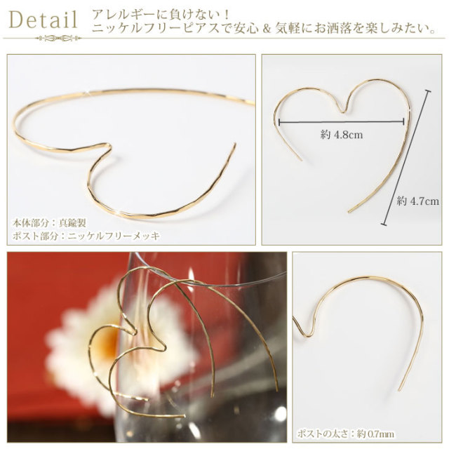 安心のアレルギーフリーピアス金属アレルギーの主な原因となるニッケルをほぼ含ます、お肌に優しい仕上げとなっております。1ペア(左右両耳用の2点)のお値打ち価格が嬉しい!《 商品詳細 》ポスト太さ:約0.7mm[サイズ]高さ約4.7cm最大幅約4.8cm*高さはデザイン部分を計測しています。[素材]本体部分:真鍮製ポスト部分:ニッケルフリーコーティング[カラー]ゴールド仕上げのイエローゴールドカラー[付属品]専用ポーチ