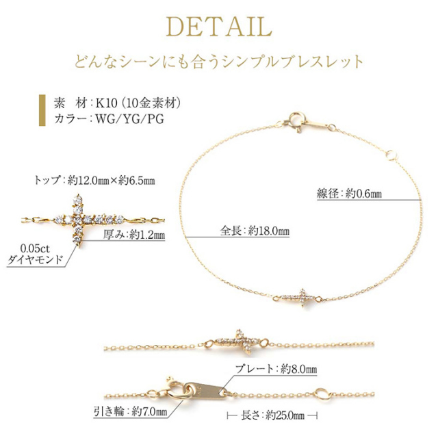 | 喜びポイント | シンプル 大人 可愛い かわいい 人気 お揃い 綺麗 キラキラ おしゃれ お洒落 トレンド おすすめ 上品 上質 高級 プチプラで高見え 10kブレスレット K10チェーン 10Kジュエリー ダイヤブレスレット クロスデザイン モチーフ ノンアレルギー アレルギーフリー アレルギー対策 アレルギー防止 アレルギーフリーブレスレット 金属アレルギー対応 金属アレルギー対応ブレスレット |