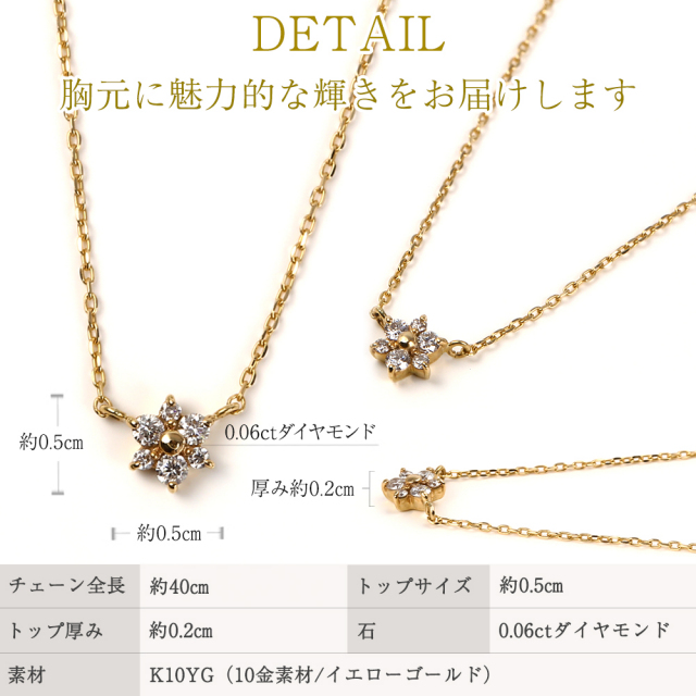 | 喜びポイント | シンプル シンプルコーデ 大人 可愛い かわいい 人気 お揃い 綺麗 キラキラ おしゃれ オシャレ お洒落 トレンド おすすめ 上品 上質 高級 プチプラで高見え 金属アレルギー対応 ニッケルフリー 10金ネックレス フラワーモチーフ 10Kネックレス 華奢ネックレス |