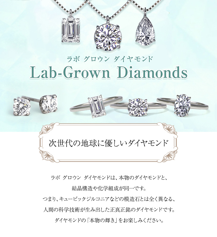 ラボ グロウン ダイヤモンドは、キュービックジルコニアなどの模造石とは全く異なる、人間の科学技術が生み出した正真正銘のダイヤモンドです。ダイヤモンドの「本物の輝き」をお楽しみください。